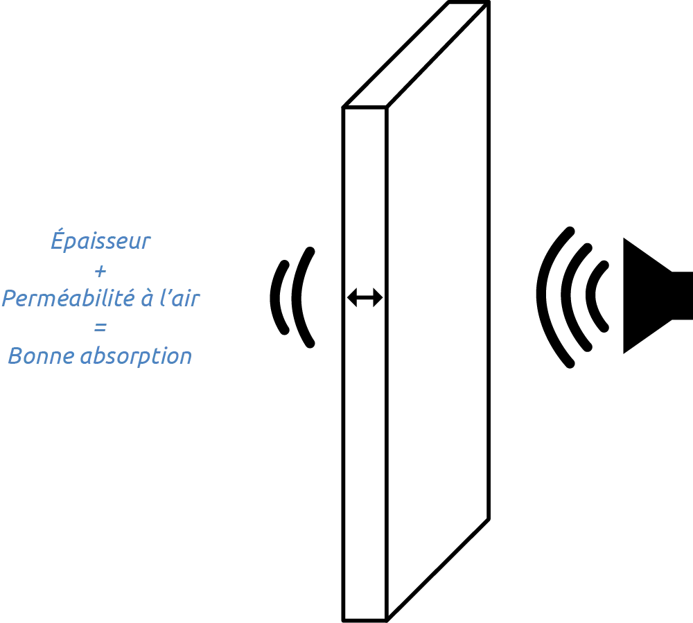 C’est la dissipation du son au travers d’un matériau (principalement les sons aigus). Généralement plus le matériau est épais et perméable à l’air, meilleur est son potentiel d’absorption.