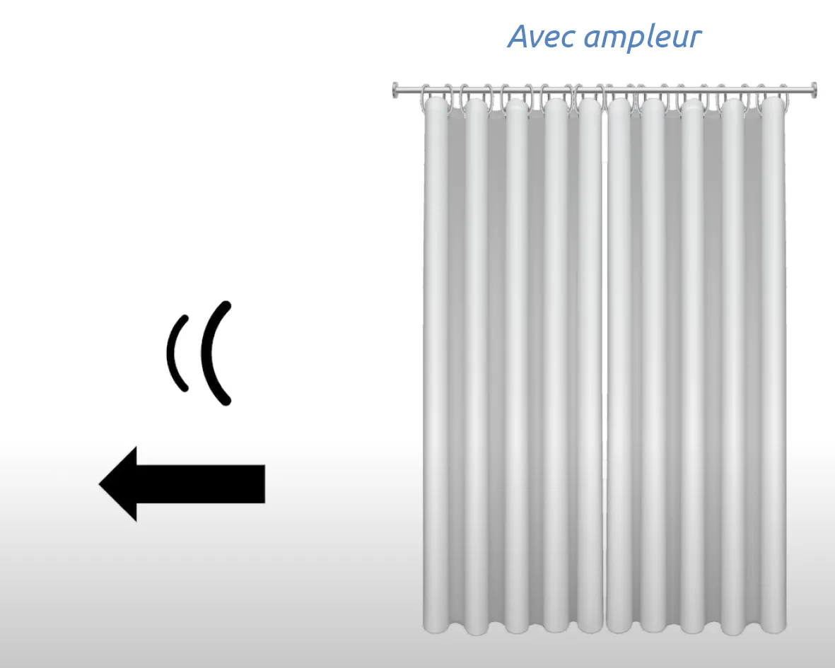 L’ampleur* augmente la surface d’échange entre le rideau et l’air dans lequel se propage l’énergie sonore, cela augmente donc la possibilité que cette dernière se dissipe de manière visqueuse et mécanique. Le mouvement naturel du rideau, induit par son ampleur, permet également d’améliorer la dissipation du son.