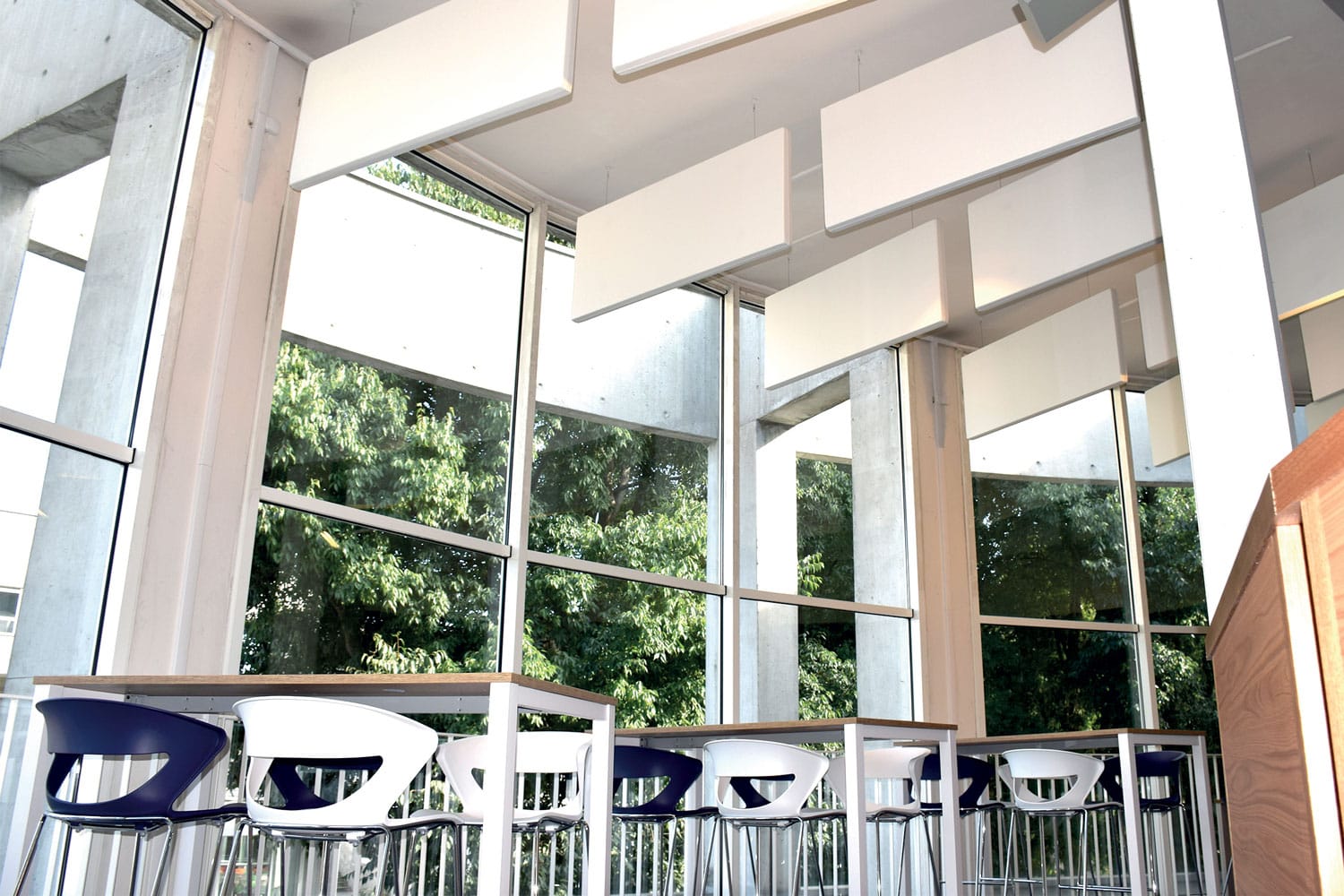 Cette implantation discrète préserve la circulation et le mobilier existant tout en apportant une solution acoustique performante.